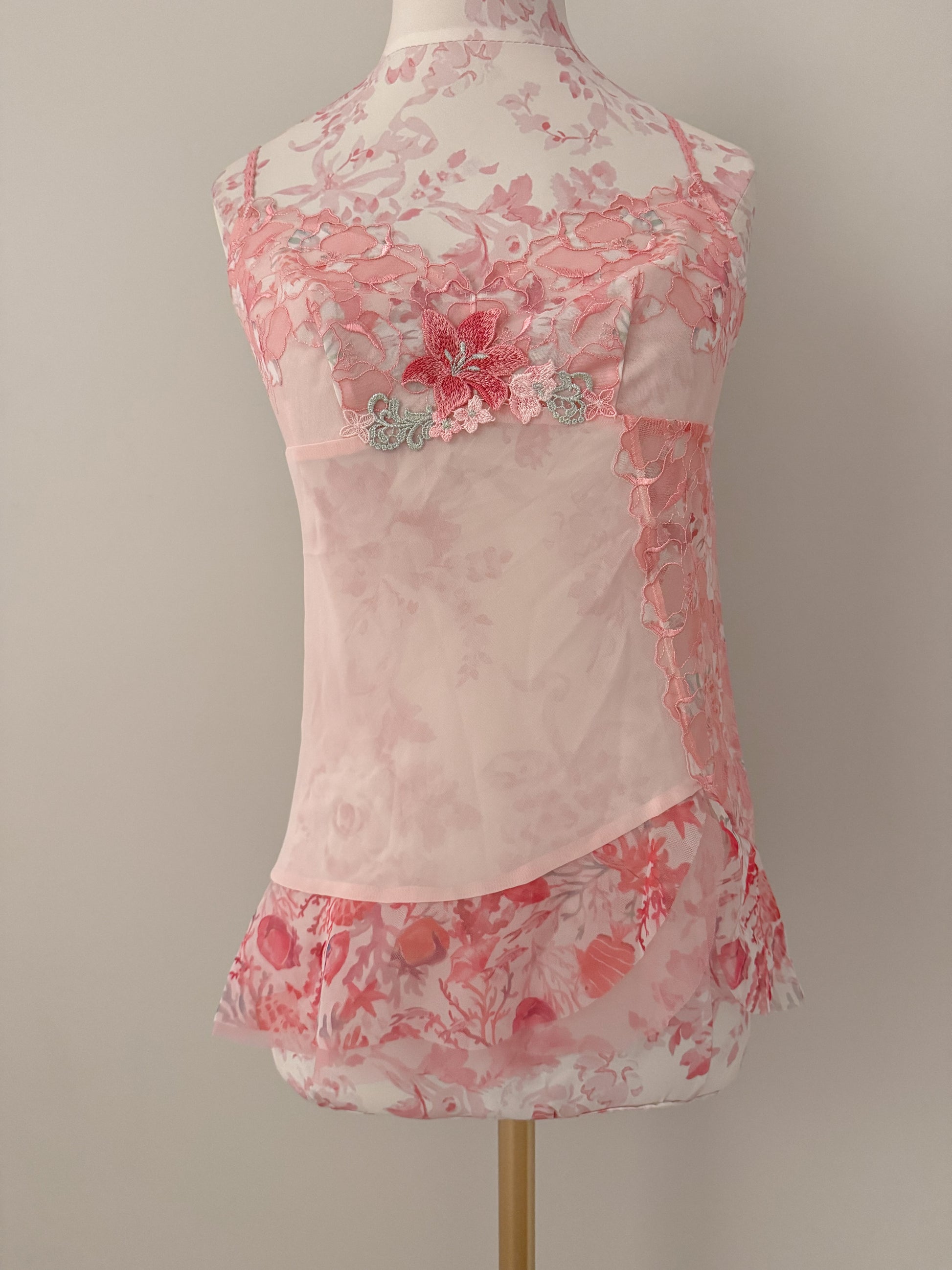 a pastel pink slip with a sheer mesh body, floral lace along the bust, and embroidered blossoms at the center. the asymmetrical hem and soft watercolor florals give it a dreamy, fairy-garden feel. perfect for a cute date idea like picking out mochi and wandering through a botanical greenhouse together.