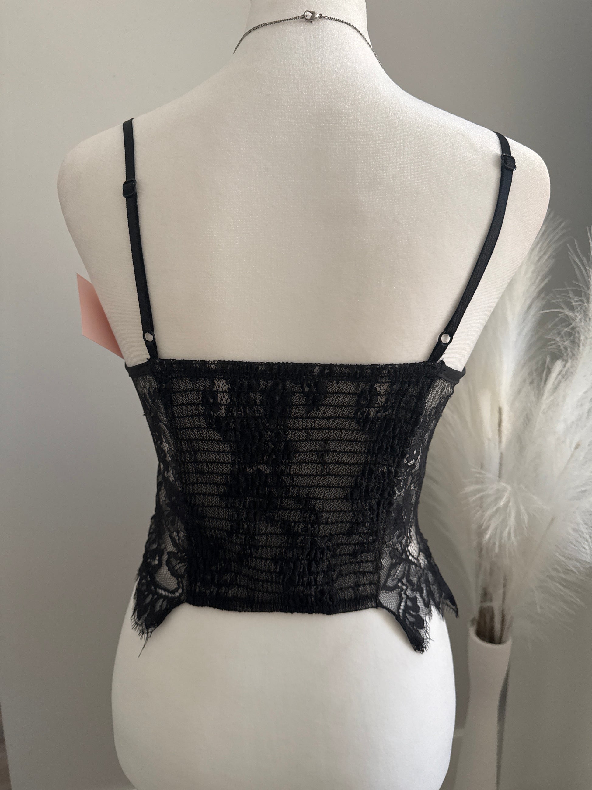 this black lace bustier top is all about delicate details, with sheer floral lace, soft boning for structure, and eyelash trim along the neckline and hem. thin adjustable straps and a front satin tie add to the romantic feel, making this the perfect piece to dress up or down. perfect for a wine and charcuterie date on the patio.
