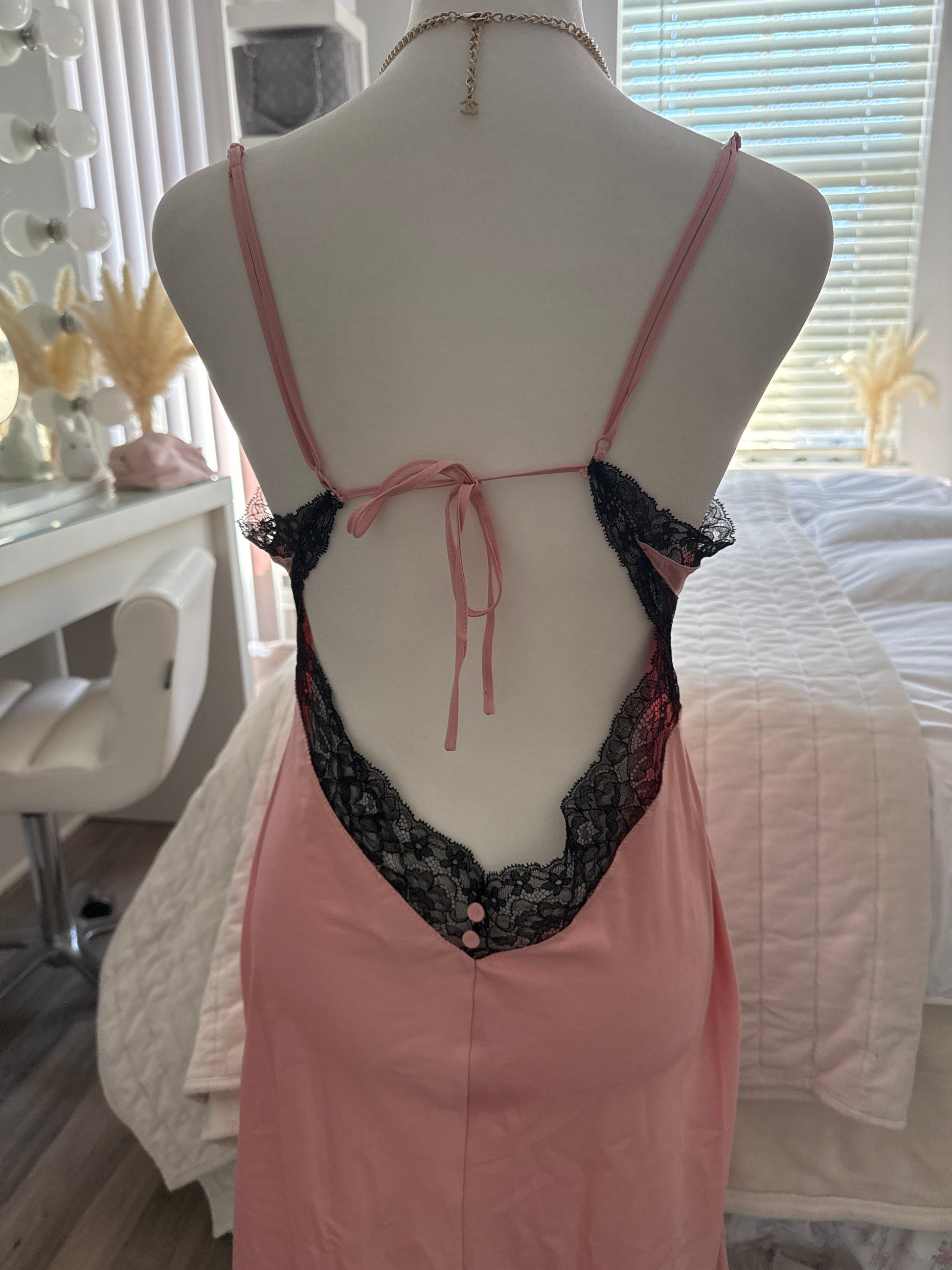 this beautiful french style slip dress features a unique keyhole cutout on the bodice, black lace trim, and an open back.