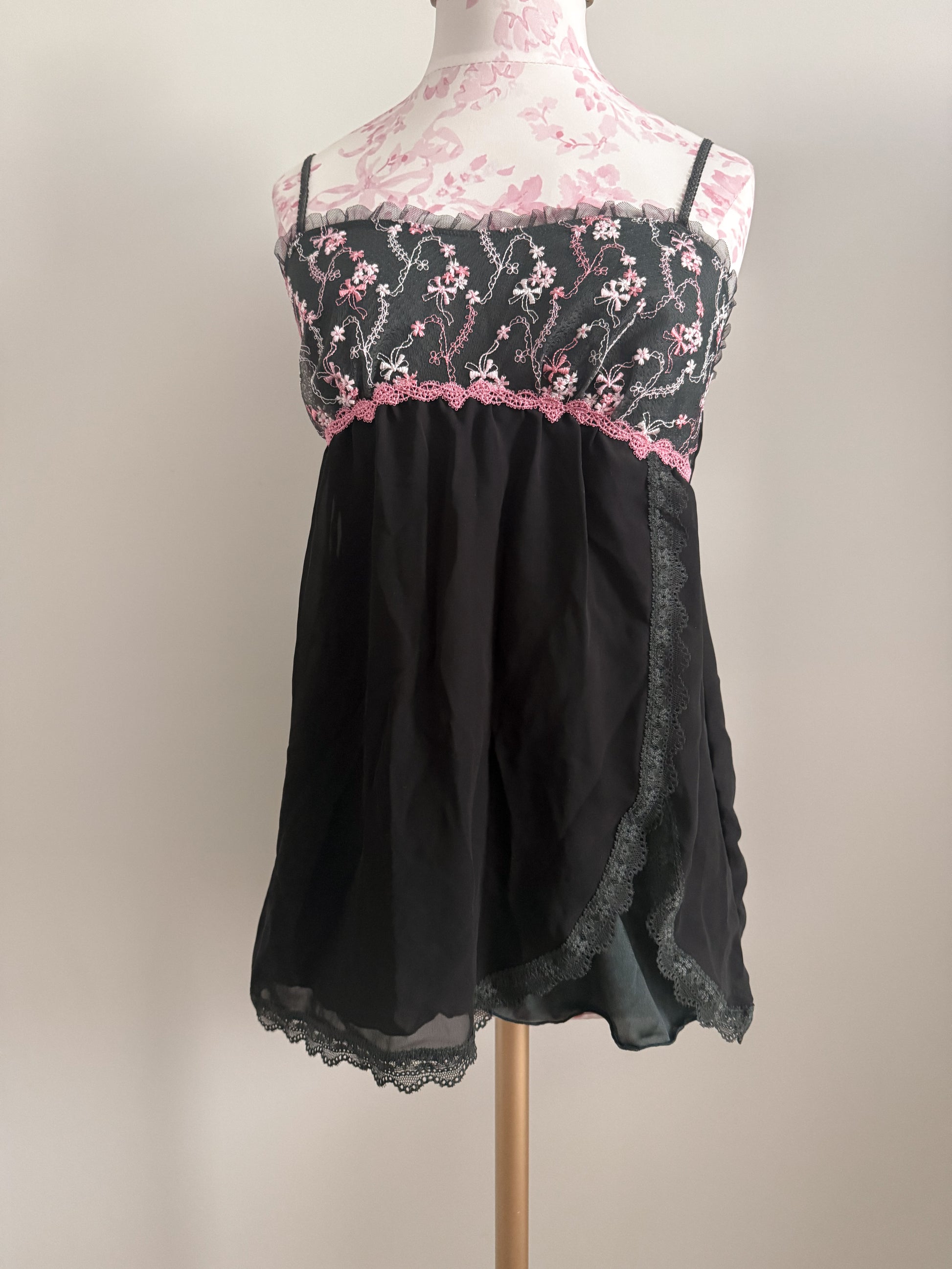 black chiffon babydoll with sheer flowy skirt, pink floral embroidery across the bust, and lace trim. perfect for a late-night dessert run after the movies.