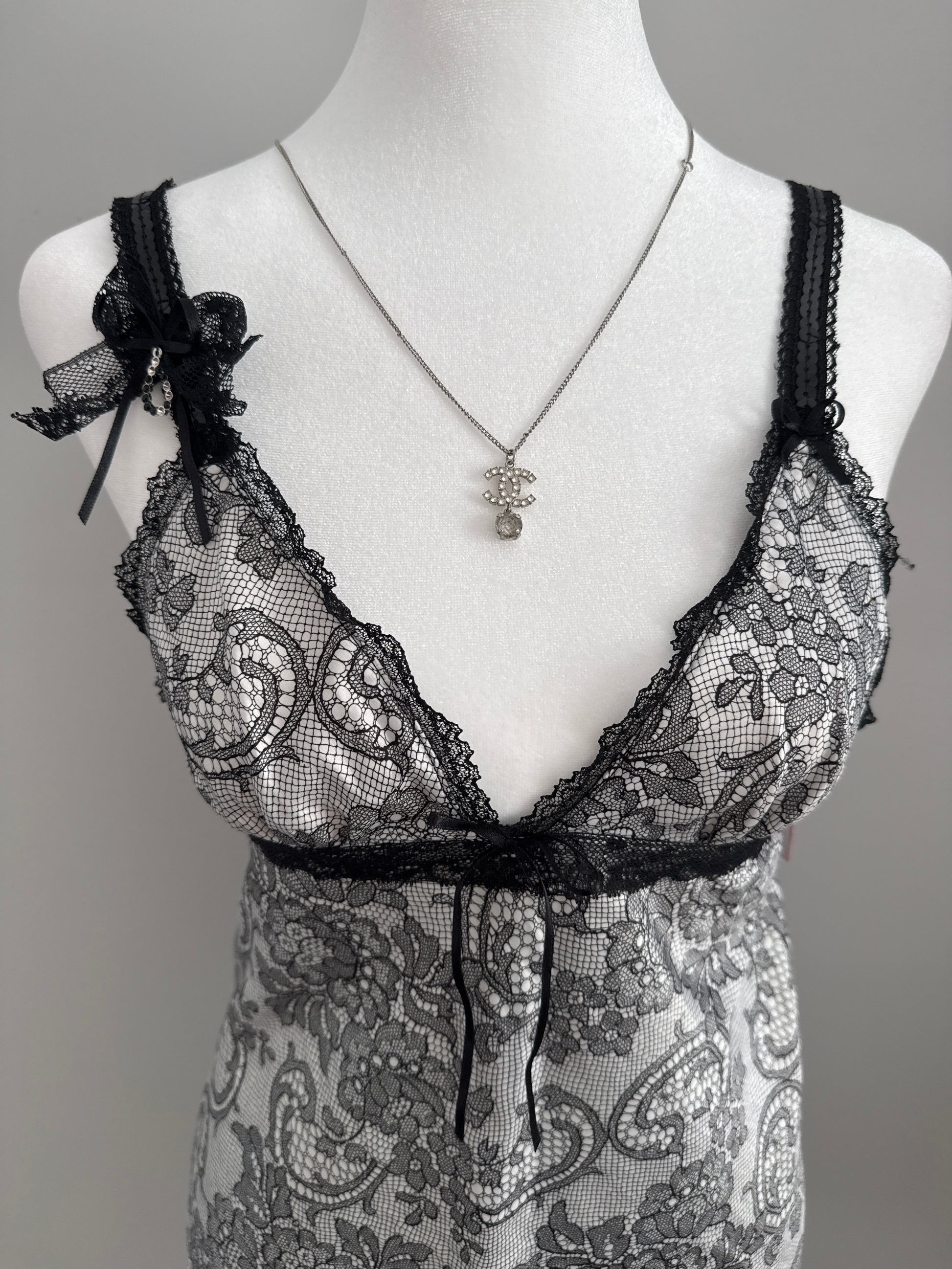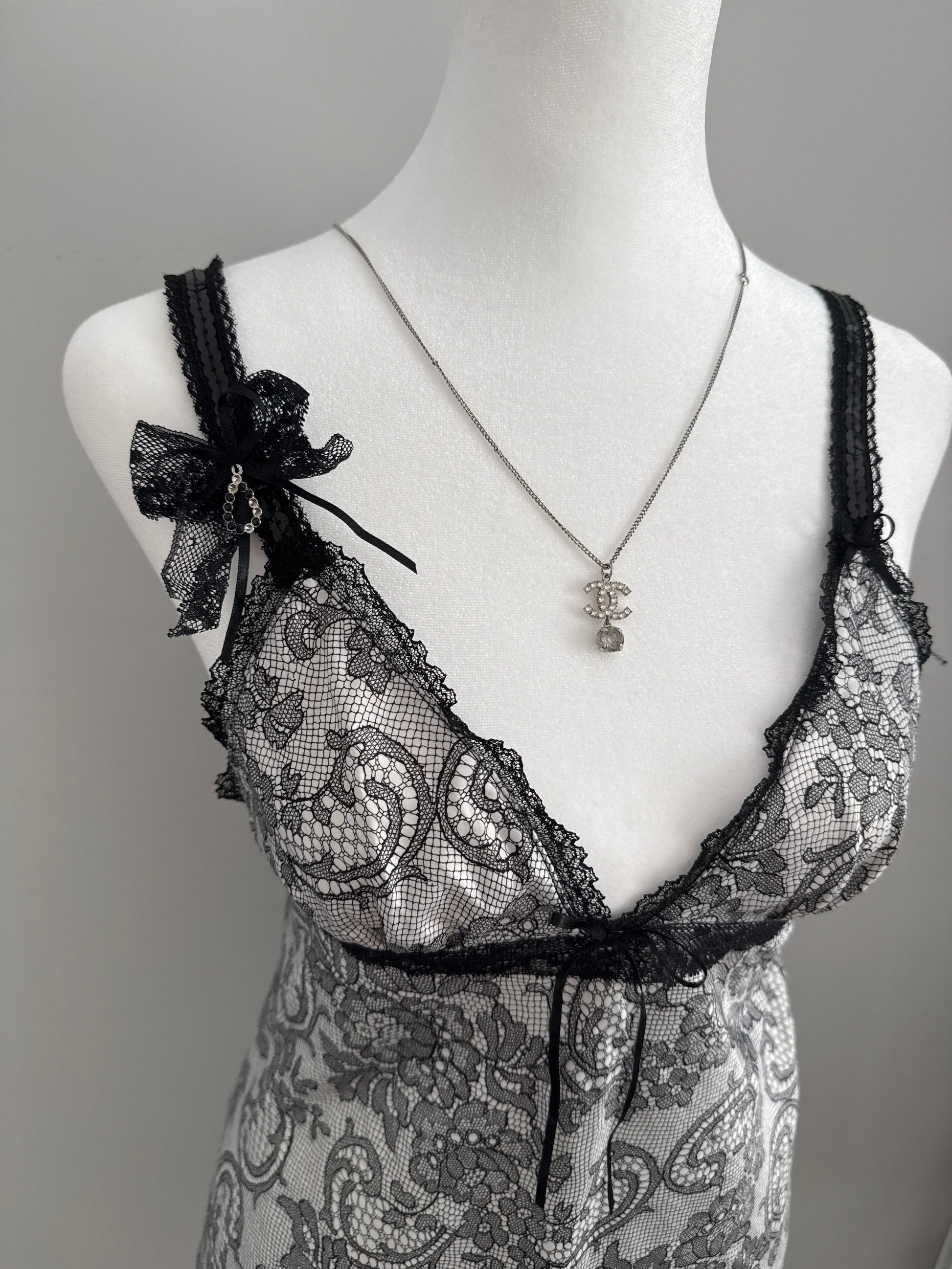 this black-and-white slip dress is a stunning mix of elegance and charm. featuring an eyelet paisley lace pattern, it’s designed with adjustable straps adorned with a side jeweled bow detail. a ribbon self-tie accent at the center bodice and a flirty ruffled hem complete the look, perfect for a chic garden party or a rooftop brunch.