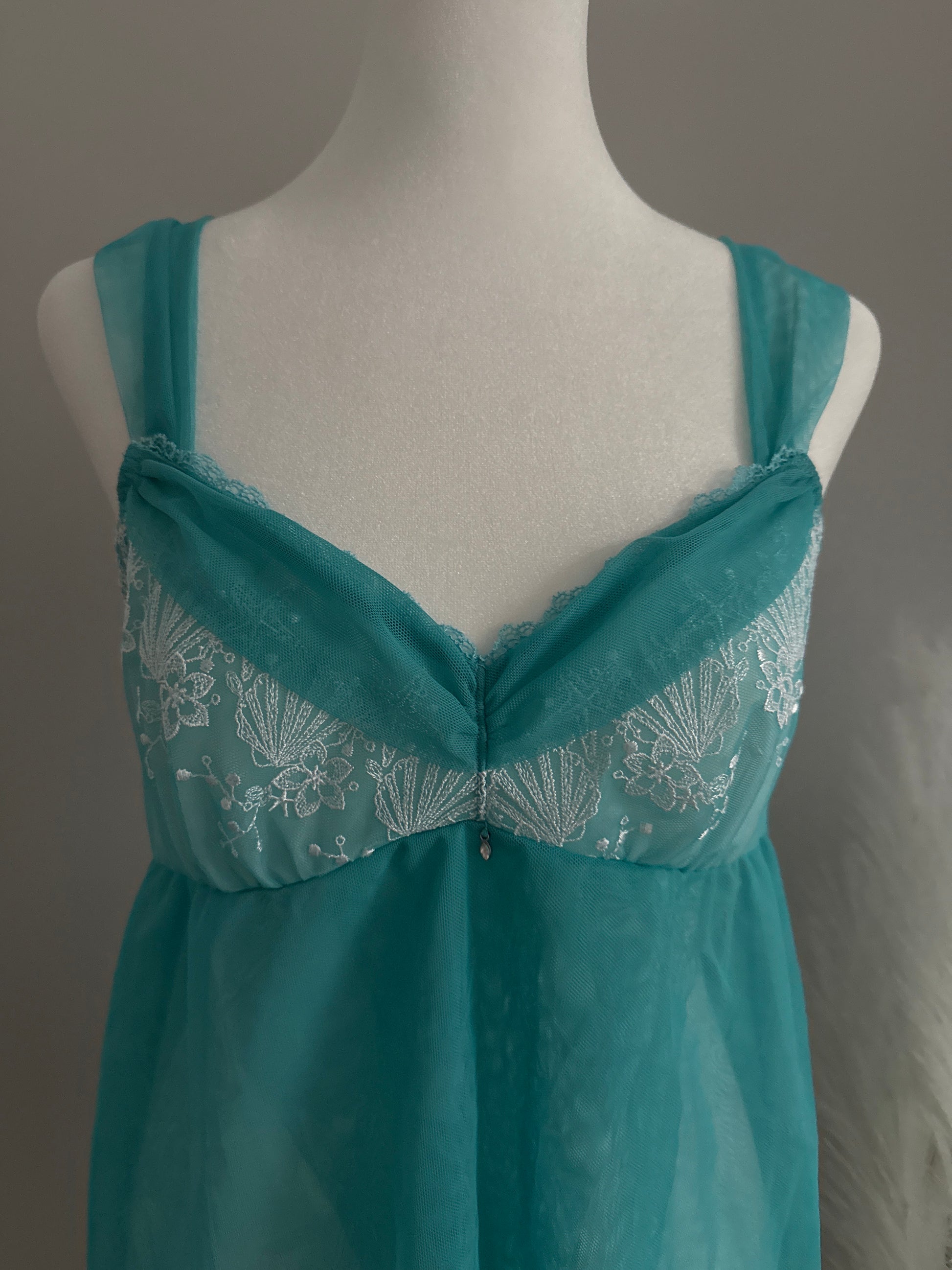 be the star of the night in this flouncy sheer camisole with unique ruched straps, an open front, and pretty embroidery on cups. it features a lovely ethereal turquoise blue color