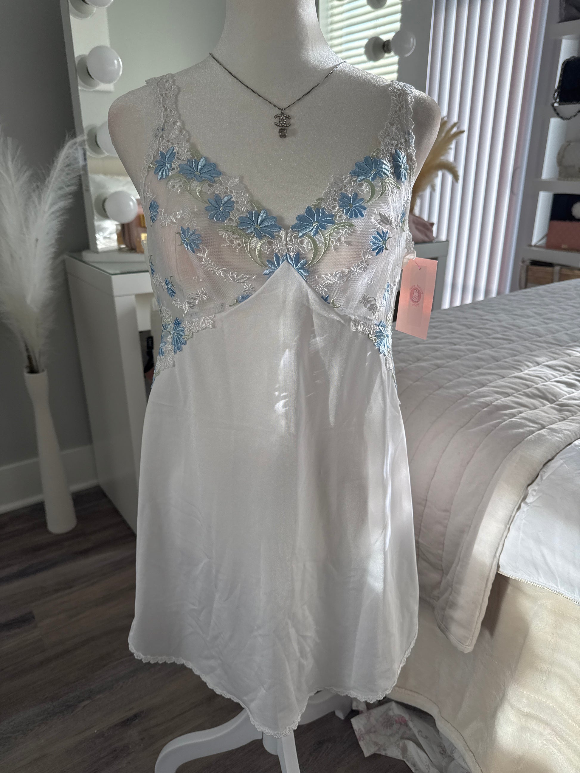 soft and ethereal, this white satin slip features delicate embroidered blue flowers and sheer lace details for the perfect touch of romance. perfect for wandering through the gardens of a countryside villa or enjoying a quiet morning on a balcony overlooking the sea with a cup of coffee in hand.