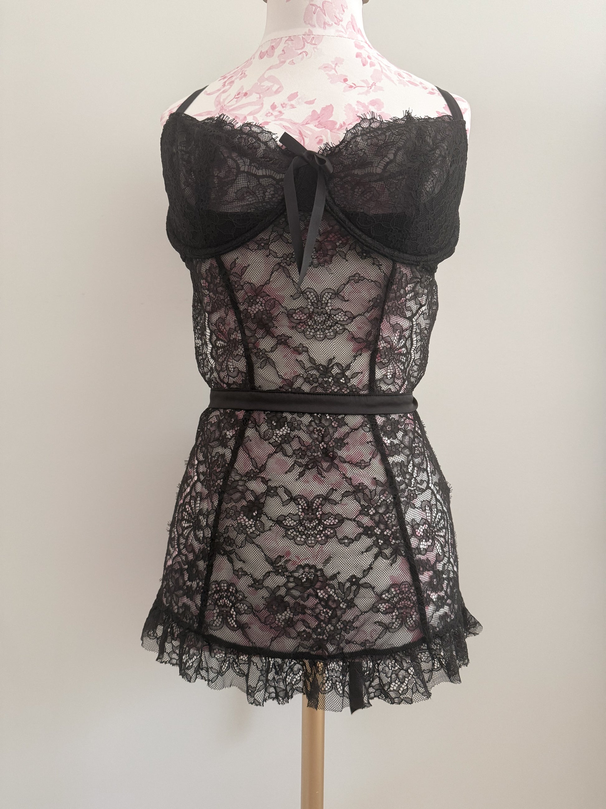 sultry black lace babydoll with underwire bust, satin bow, and flirty ruffle hem perfect for candlelit lounging and nights that taste like red wine and secrets