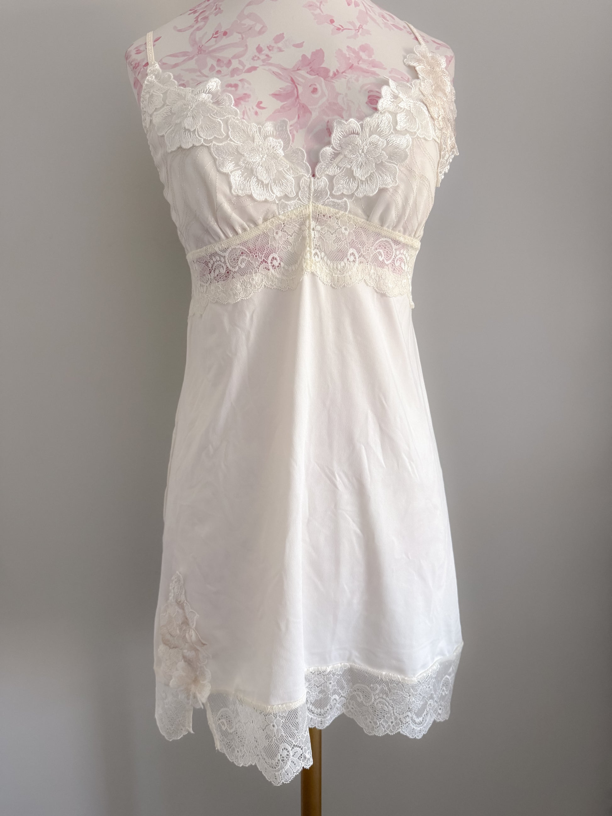 ivory satin slip with soft floral appliqué lace bust and scalloped lace hem. features a delicate lace waistband that cinches slightly for a flattering fit. perfect for a quiet breakfast in bed or an afternoon picnic under the shade with a woven basket and sparkling lemonade.