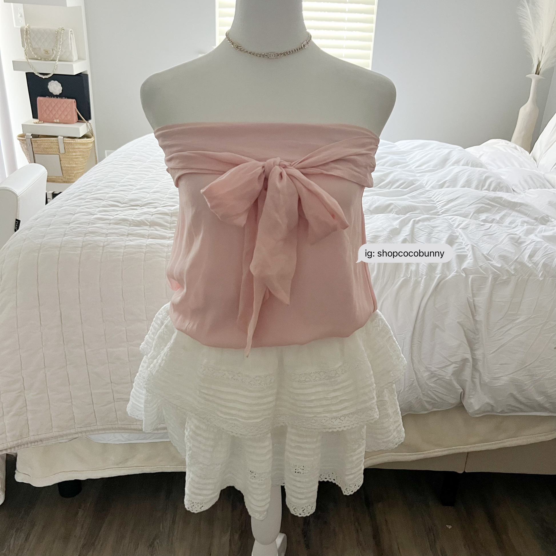 drop jaws with this ever-so-delicate pink bandeau tube top featuring a self-tie front detailing. it’s crafted with a chiffon woven fabric in a pastel pink color way. personalize this top by either tying the ribbon bow in the front or back. non sheer.