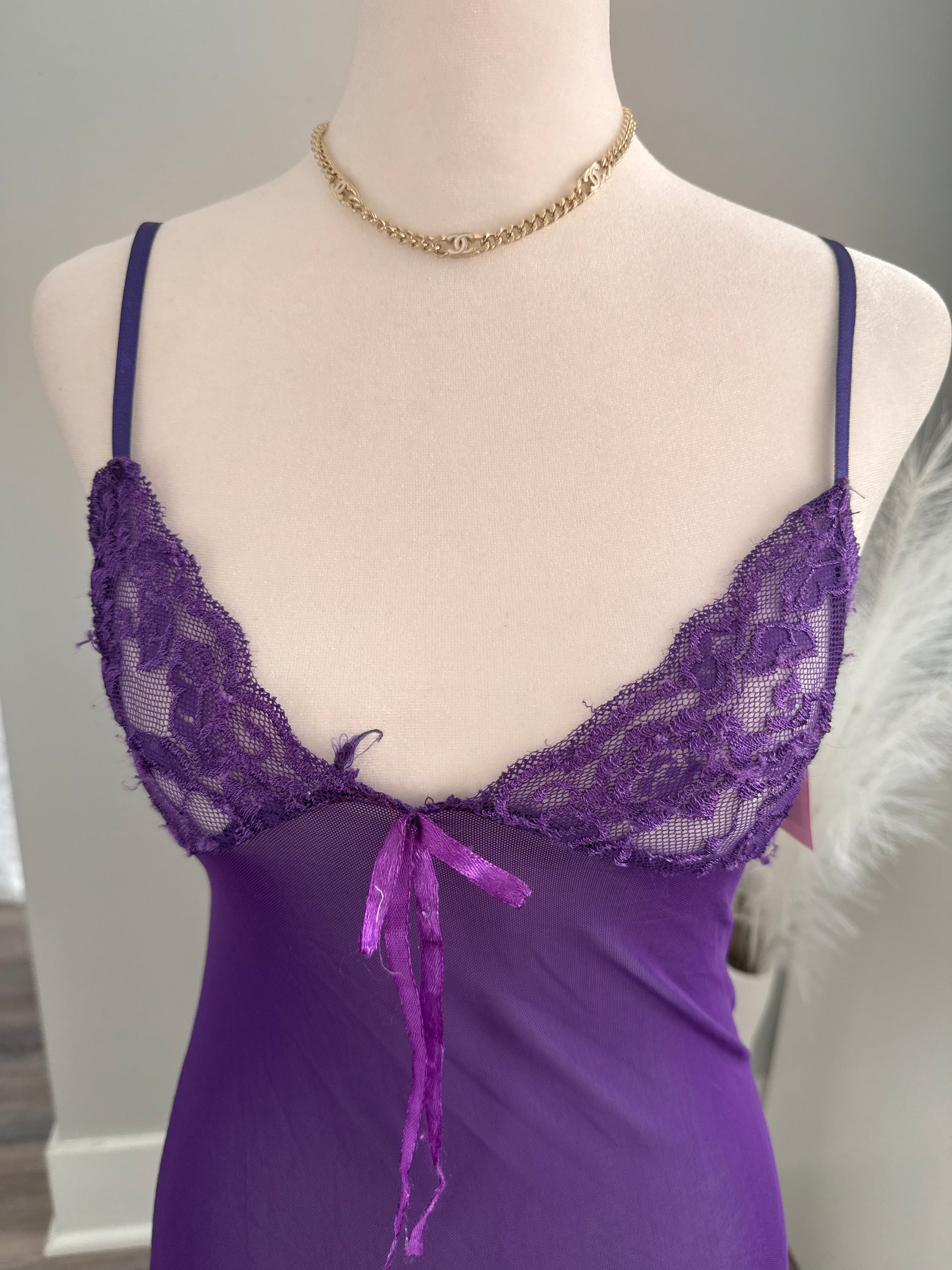 flowing like a gentle breeze, this sheer-fit purple slip dress is designed to celebrate movement and femininity, blending comfort and elegance seamlessly in all the right areas. fitted silhouette, embroidery bodice, lace hem, bow detail in the center front, and adjustable straps.