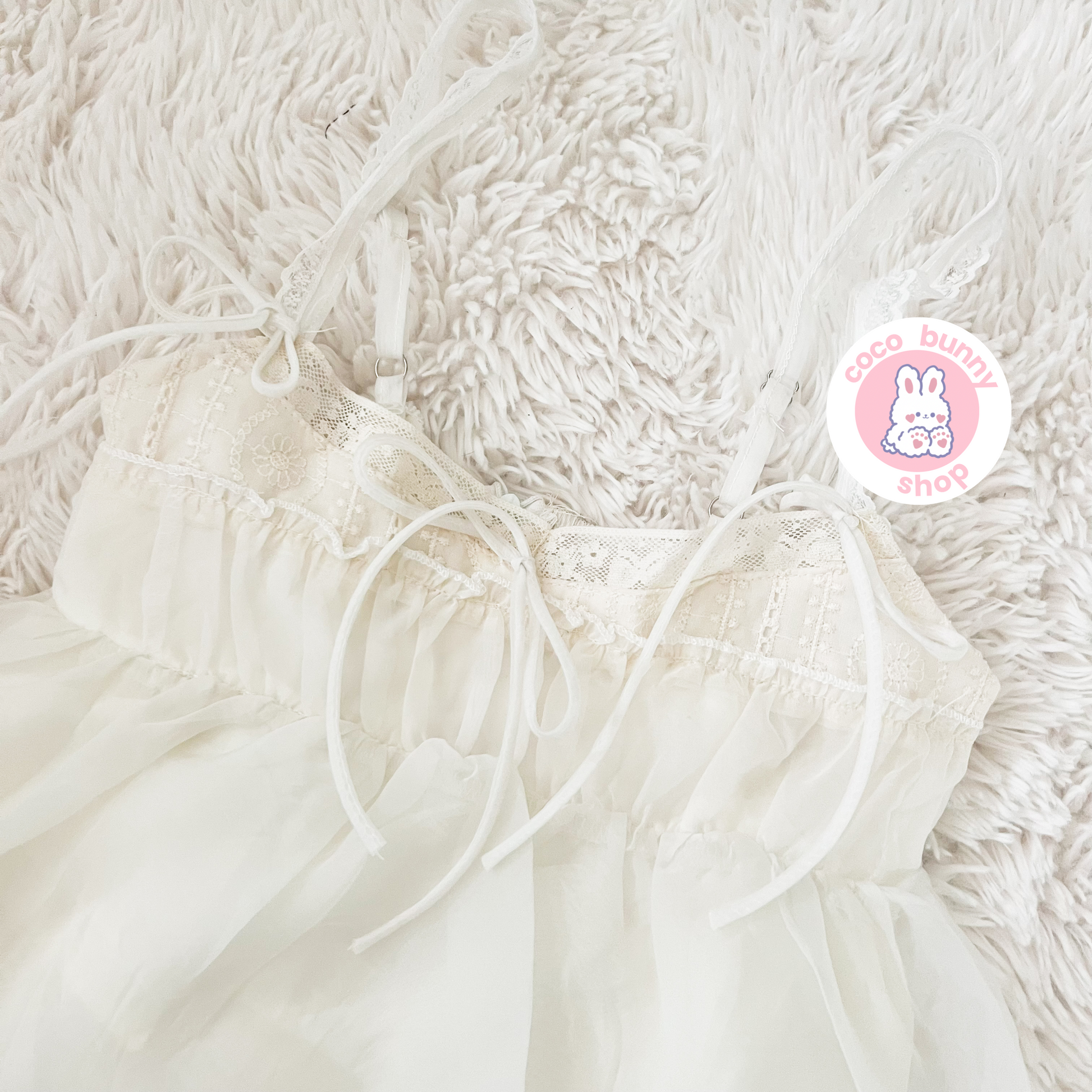crafted with ultra feminine inspiration, this babydoll silhouette camisole showcases a ruffled lace trim edging, self tie bows on straps and center, and ruched bodice