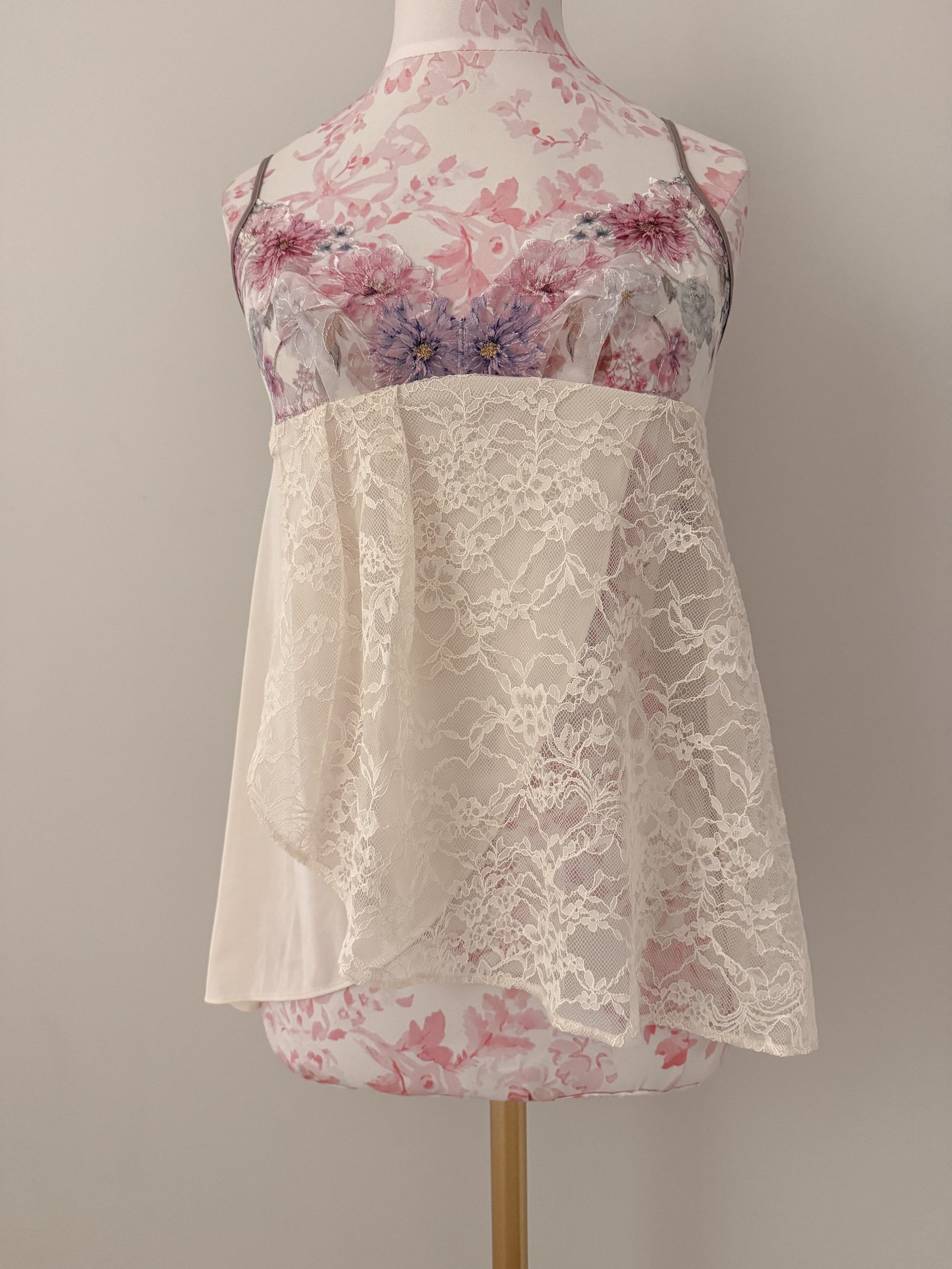 a dreamy ivory cami with cascading lace and soft lavender floral embroidery. perfect for a slow morning date making french toast together and sipping iced lattes by the window.