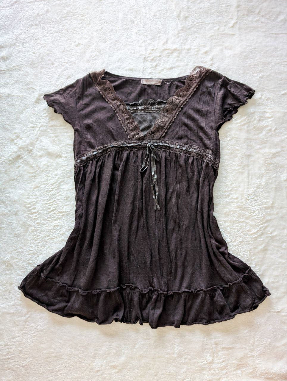 chocolate brown lace-trim milkmaid babydoll top with a flirty ruffle hem and tie detail. dreamy for a cozy coffee shop date on a rainy afternoon.