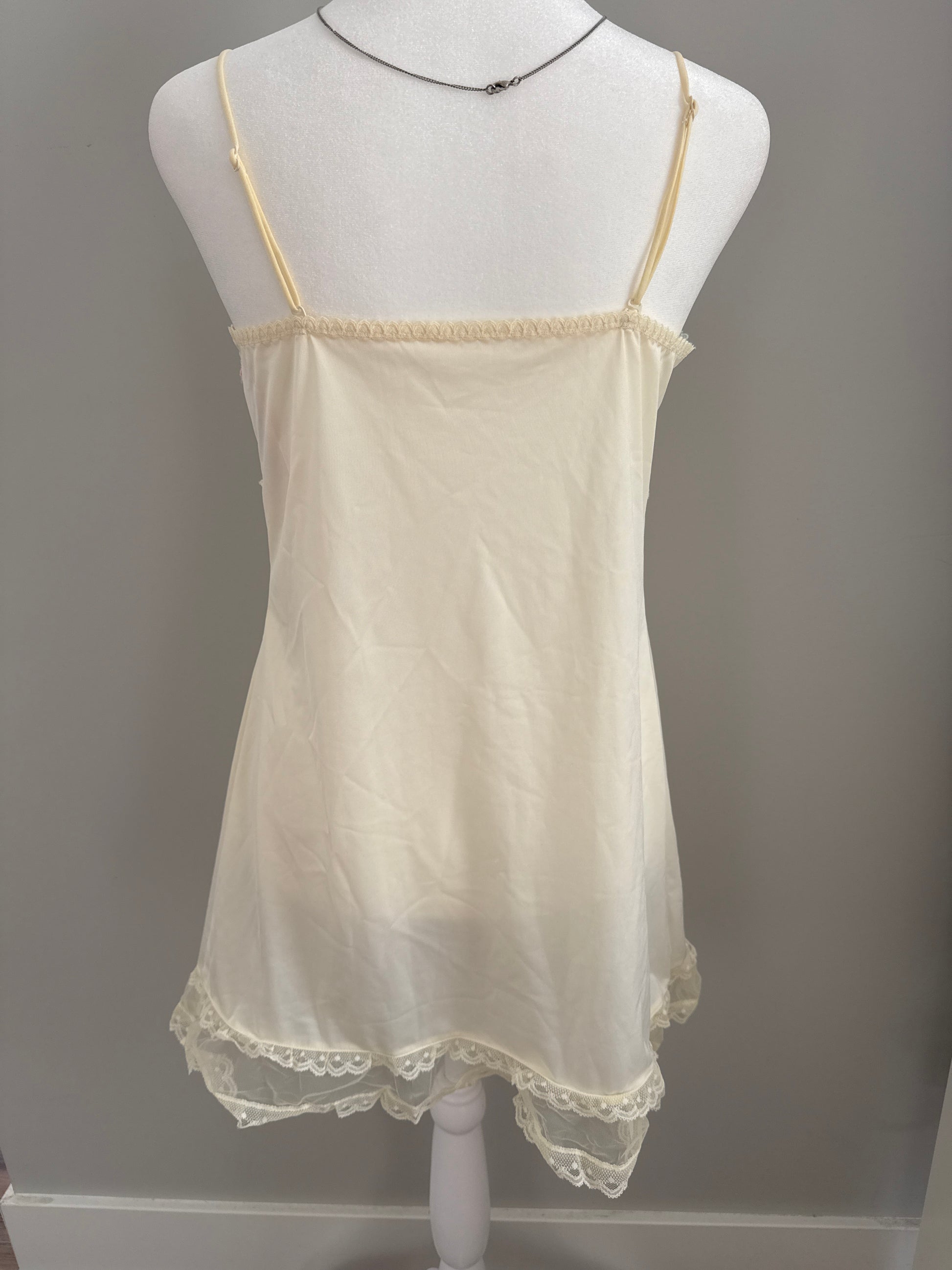 this sheer pale yellow slip dress is effortlessly charming, with pastel floral embroidery, pink bow details on the adjustable straps, and a sweet center ribbon. Finished with ruffle trim and hem, it’s perfect for a dreamy garden picnic or picking fresh flowers with friends