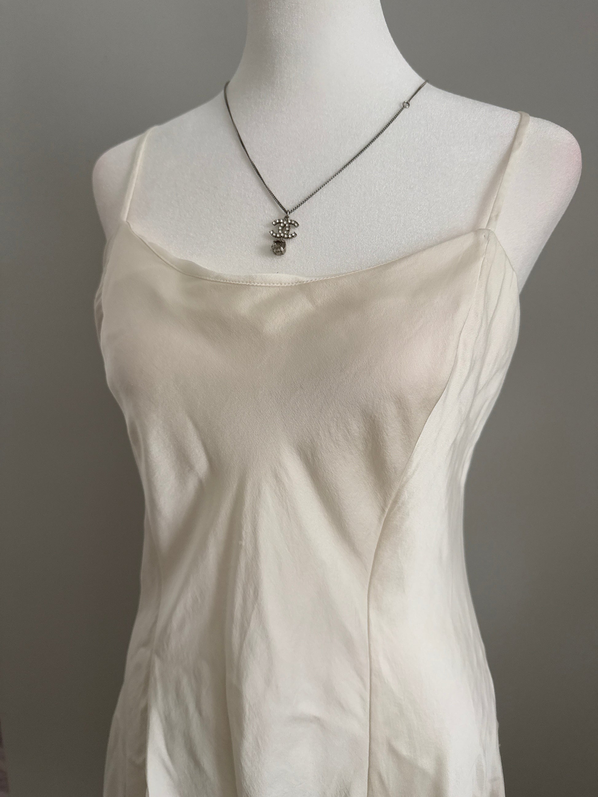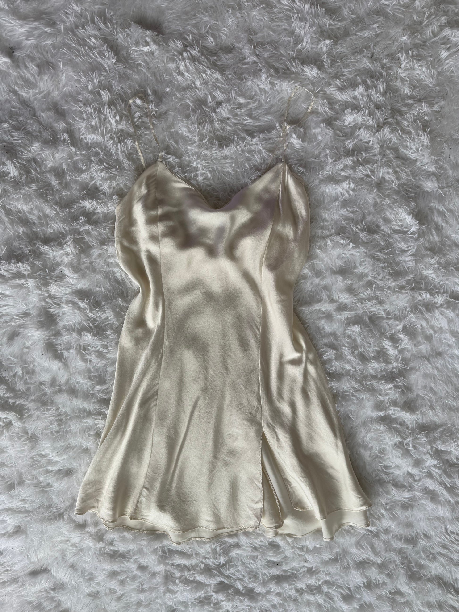 A timeless slip with effortless elegance. This vintage ivory slip dress features soft, flowing fabric with a delicate drape and a subtle thigh slit for a hint of allure. With its barely-there straps and classic silhouette, it’s perfect for a dreamy morning at a sunlit cafe sipping cappuccino.