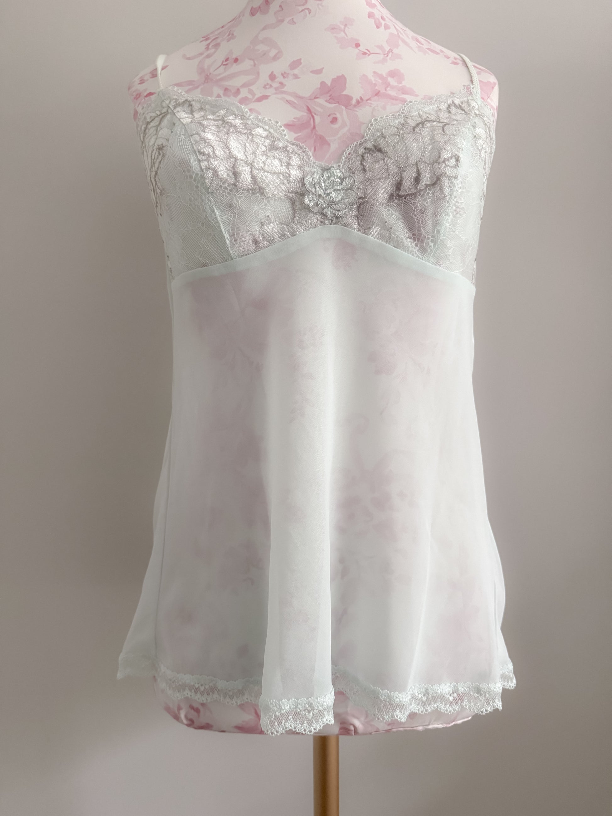 this icy white chiffon camisole is a soft breath of air making it perfect for a morning café date with almond croissants and sleepy conversation. delicate lace kisses the bodice while the sheer body floats like cream in a cold brew. just add lip balm and a tote bag full of poetry.
