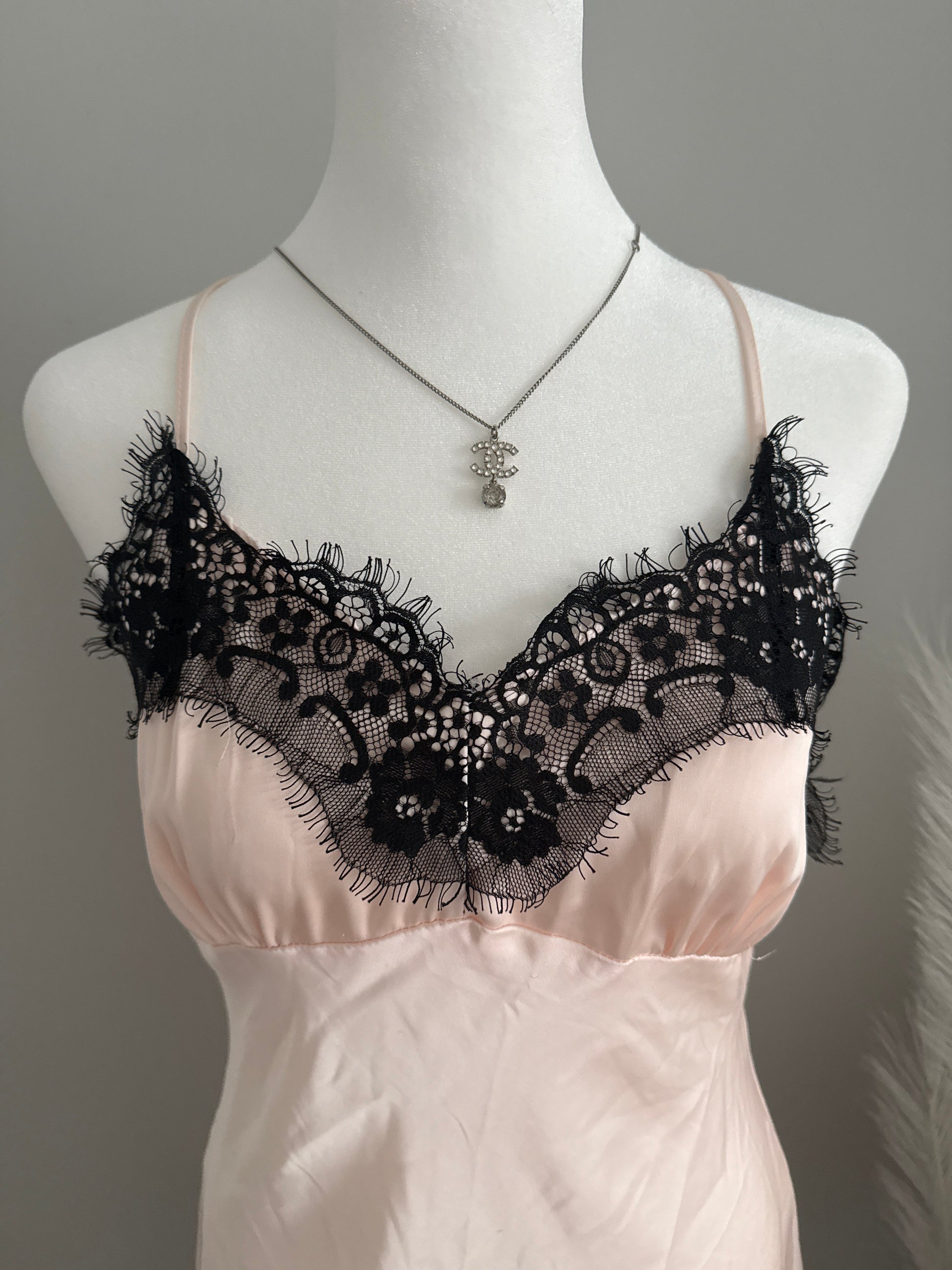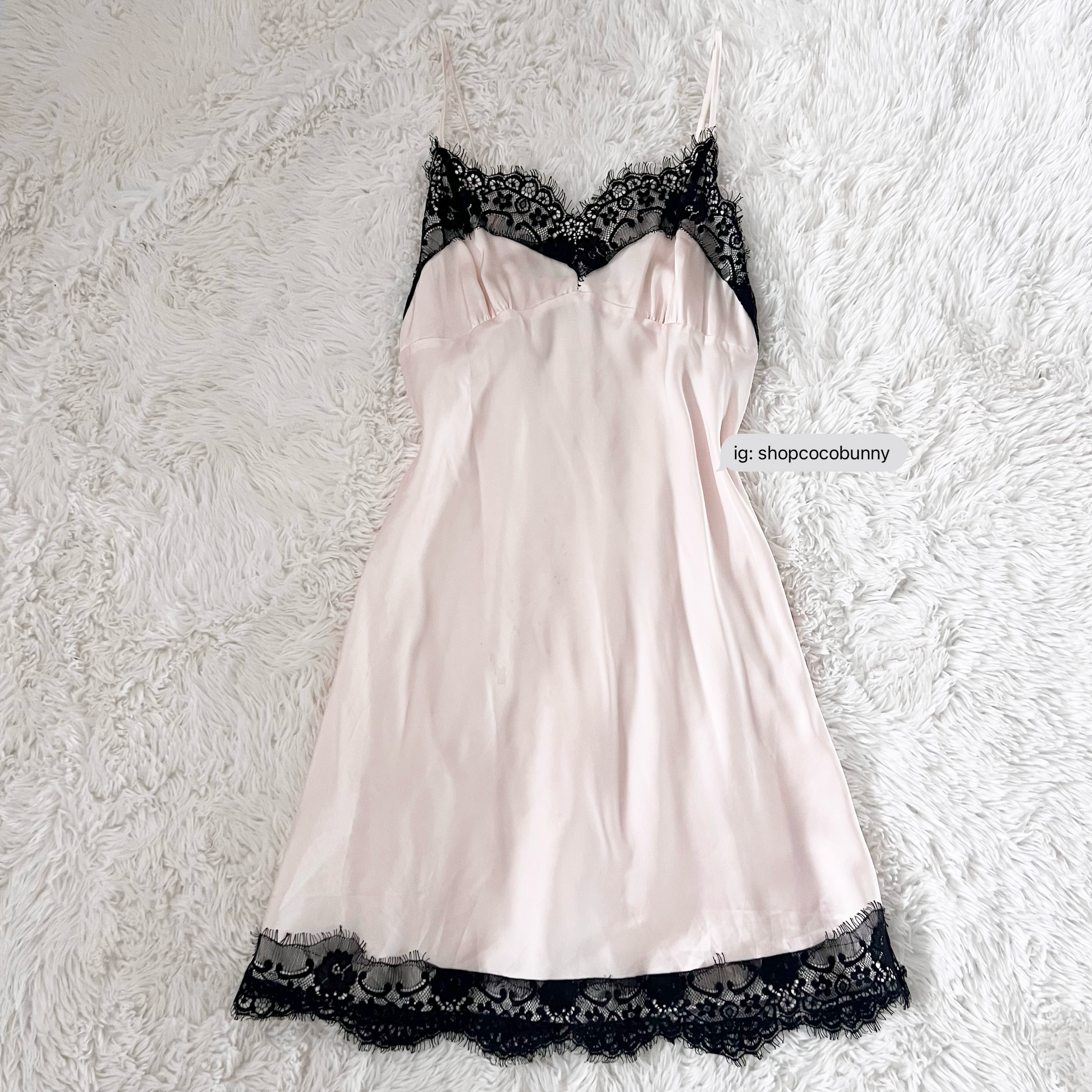 designed for the hopeless romantic, this pink mini dress exudes feminine energy. rendered in pink satin, this slip dress features a sweetheart neckline, thin adjustable straps, and trims with slotted black eyelet lace