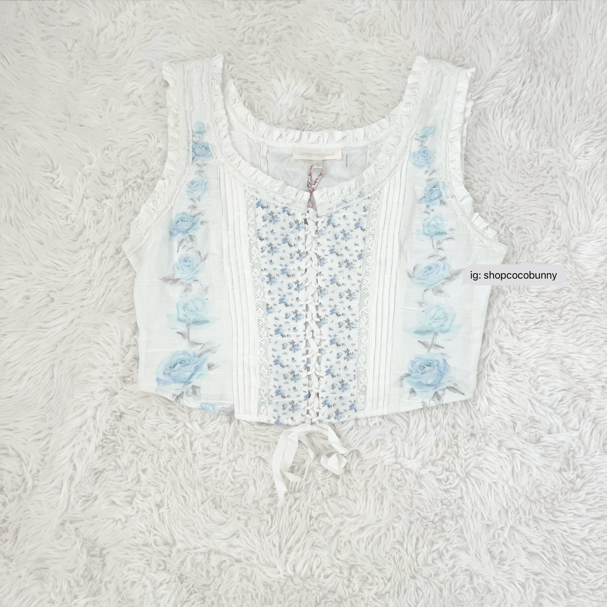 victorian romance reimagined in this corvelle cotton bustier top. dreamt up with a hand-painted rose print in 100% cotton, this top features a raw shirring bias cut and pin tuck edges around the neckline and the straps to create a feminine silhouette. sweet ribbon detail is laced through the center front finished with a secure tie dividing custom lace insets. the top includes a zipper closure for functionality. item is new with tags condition. please review all photos