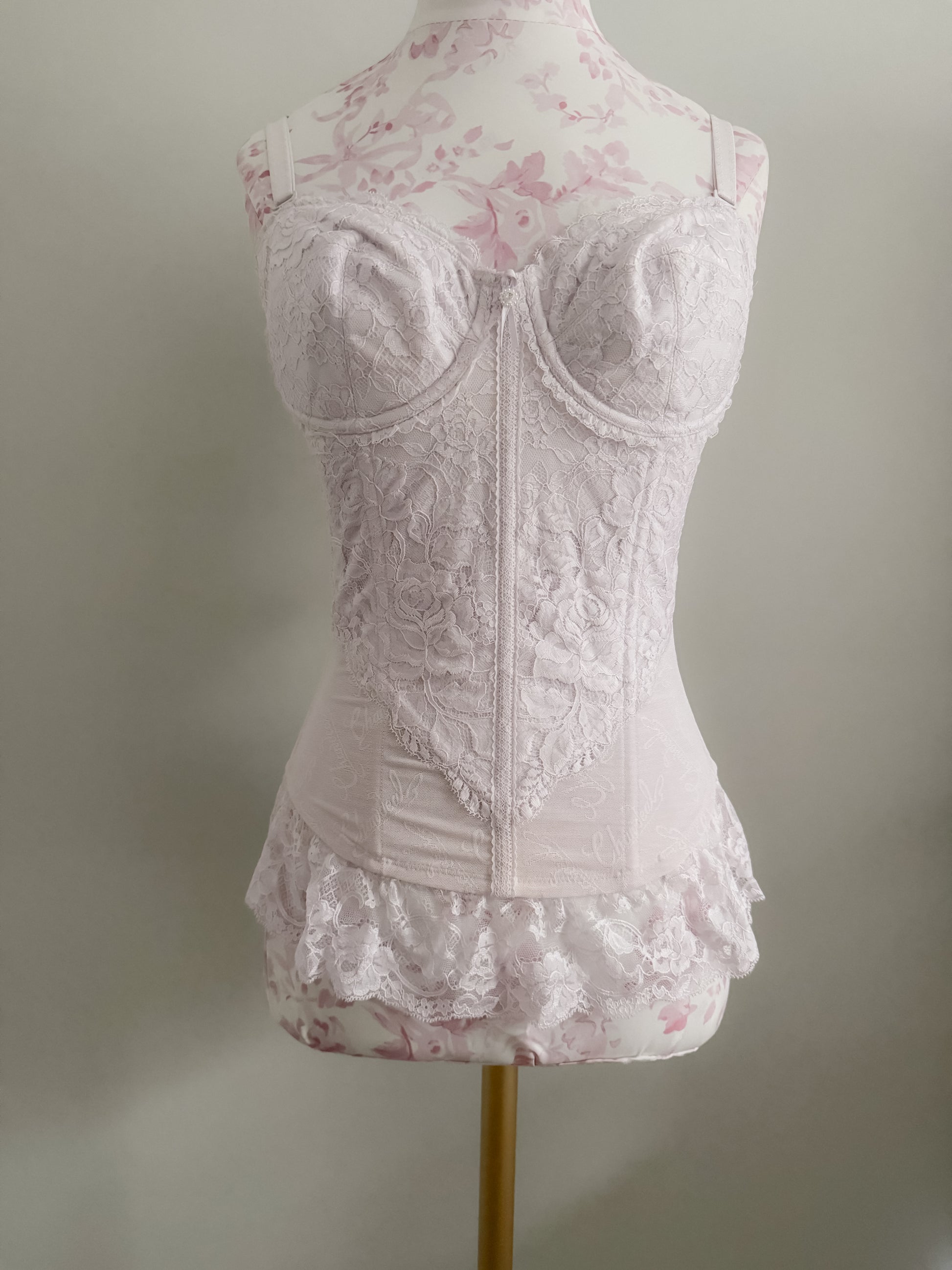 soft and structured in the dreamiest blush tone, this vintage bustier is all about shaping and sweetness. featuring floral lace, a sculpted fit, and delicate ruffled trim at the hem, it’s a piece that hugs in all the right places. pair it with jeans and heels for rooftop cocktails as the sun sets pink.