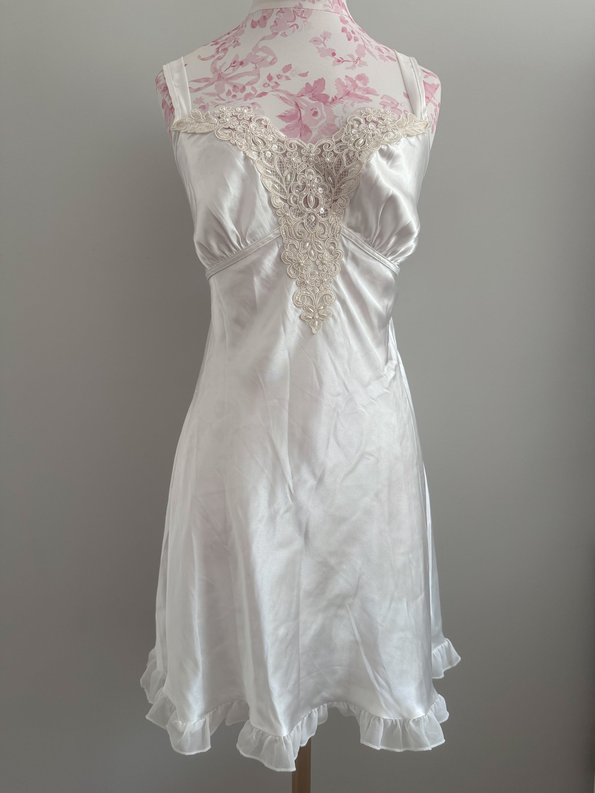 creamy white satin mini with baroque lace detailing and delicate ruffle trim best worn with a vanilla soft serve in hand, ballet flats, and a fresh spritz of something floral