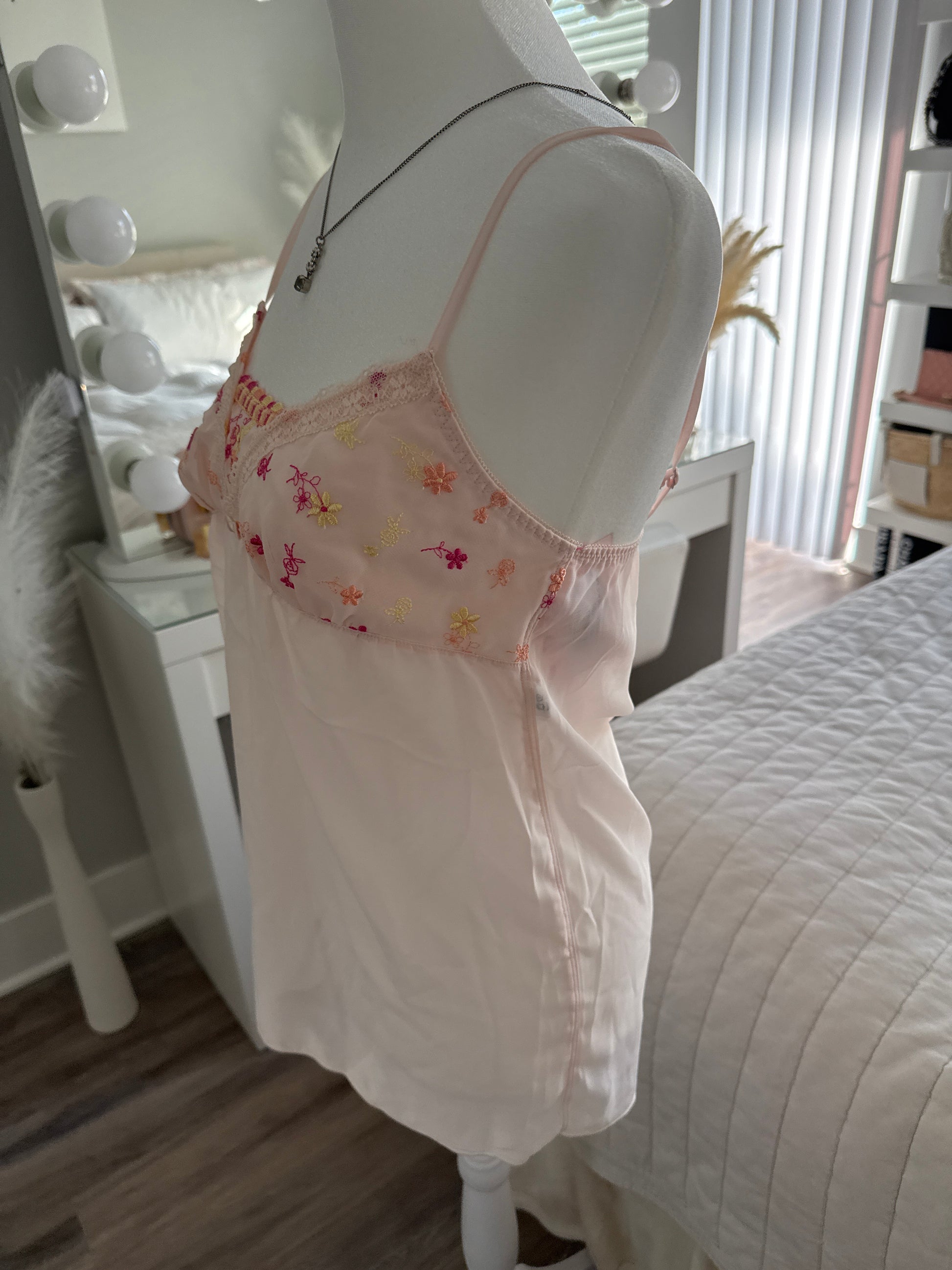 this ballerina pink camisole is a romantic standout, featuring a sweetheart neckline with scalloped embroidery and a charming center bow detail. the ruched bodice and fitted silhouette are accented with playful yellow, orange, and magenta embroidery, making it a lovely choice for a day at the art museum or a cozy café date.