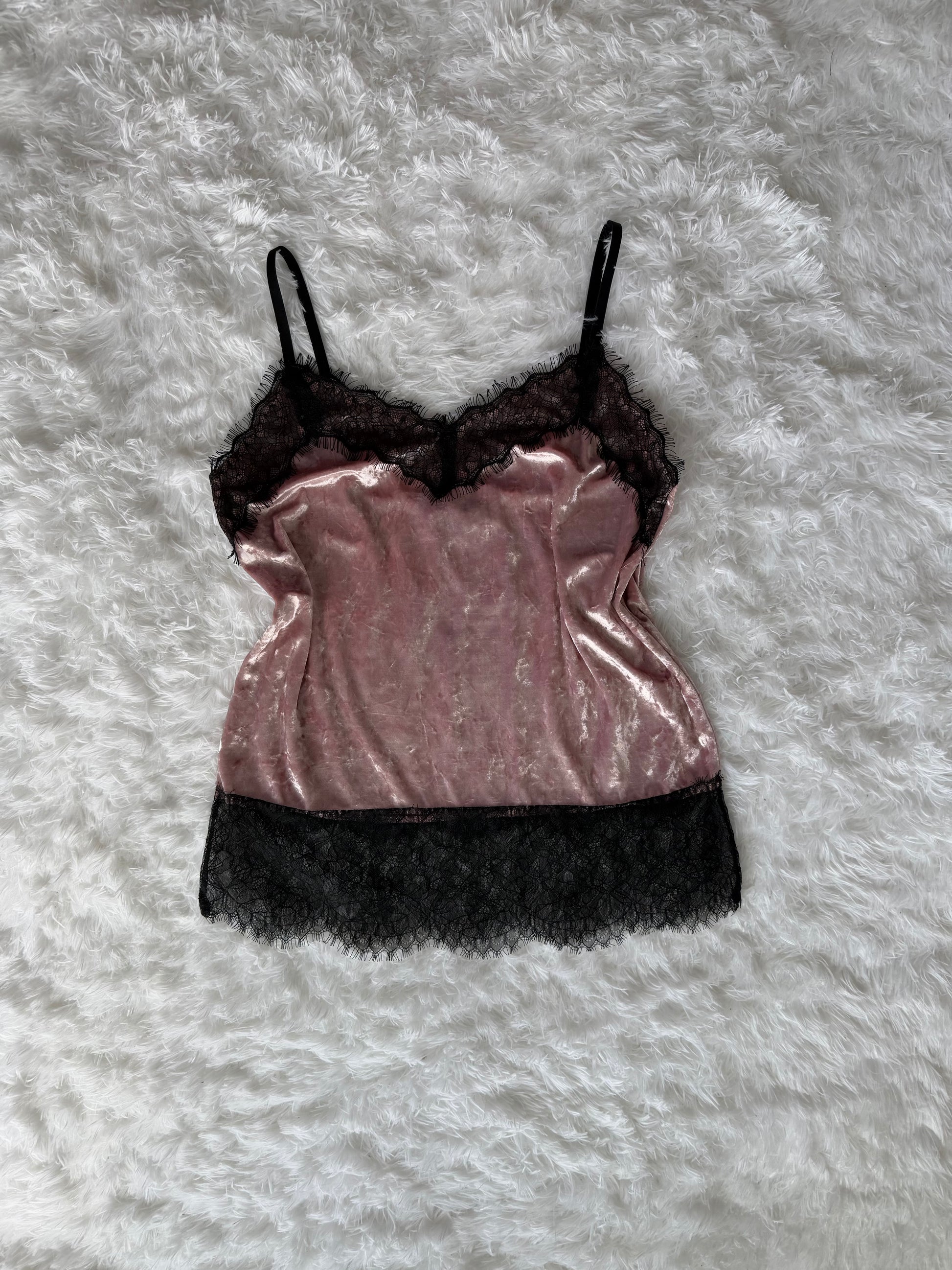 moody and romantic, this crushed velvet camisole in a soft rose hue is trimmed with delicate black lace for the perfect mix of sweet and sultry. a dreamy piece for an evening of sipping espresso and listening to vinyl records.