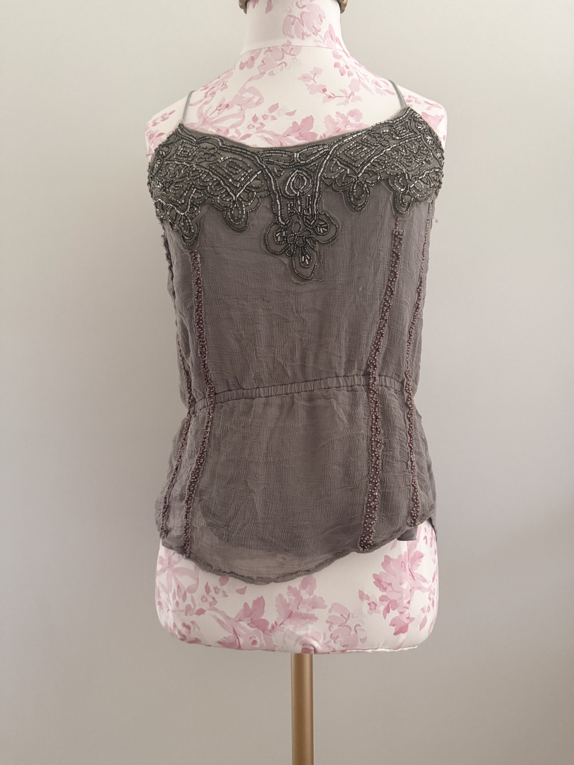 dusty taupe spaghetti strap cami featuring ornate beaded embroidery along the neckline and delicate vertical bead acents. perfect for a candlelit rooftop dinner date paired with a glass of chilled pinot grigio