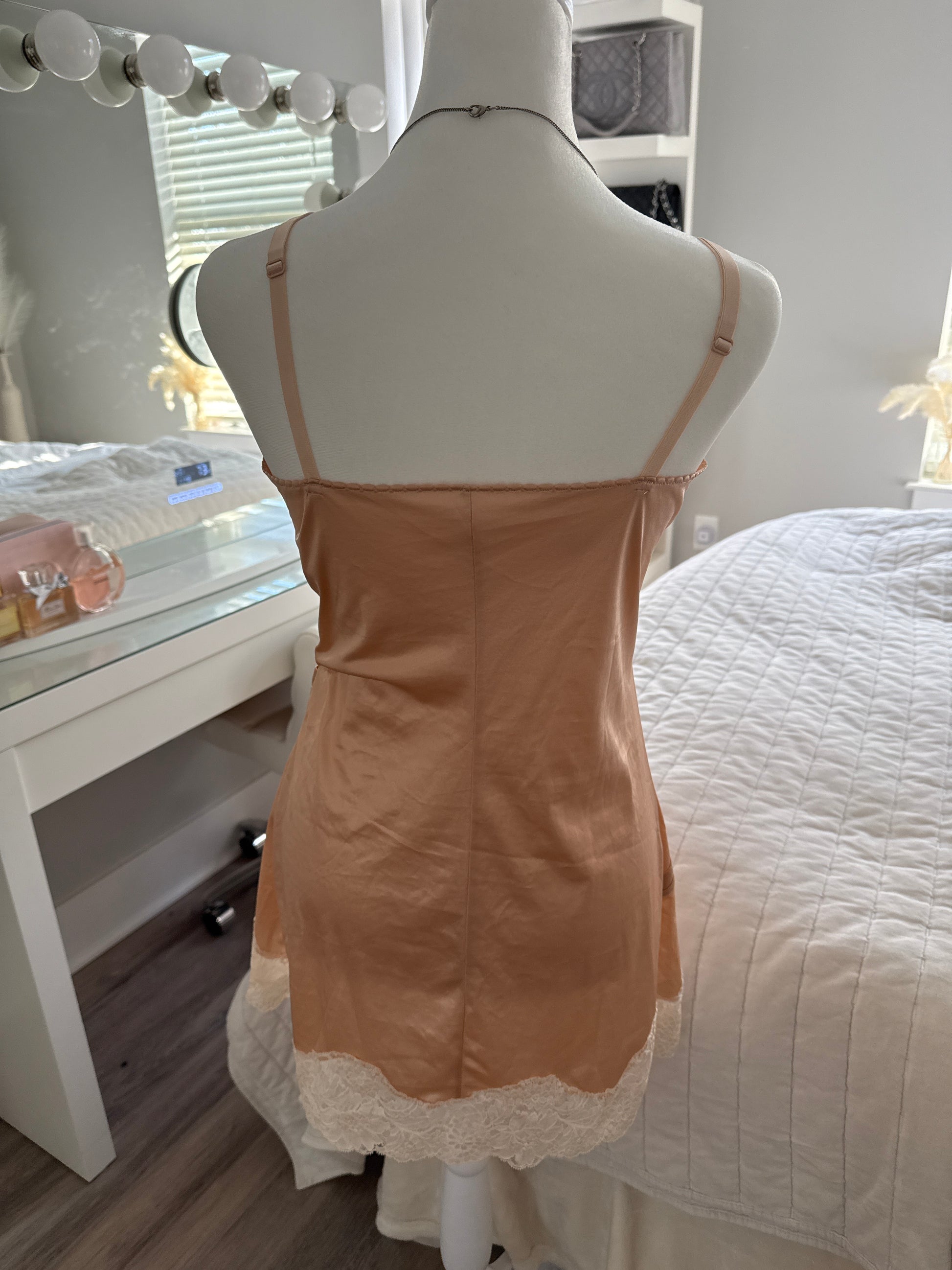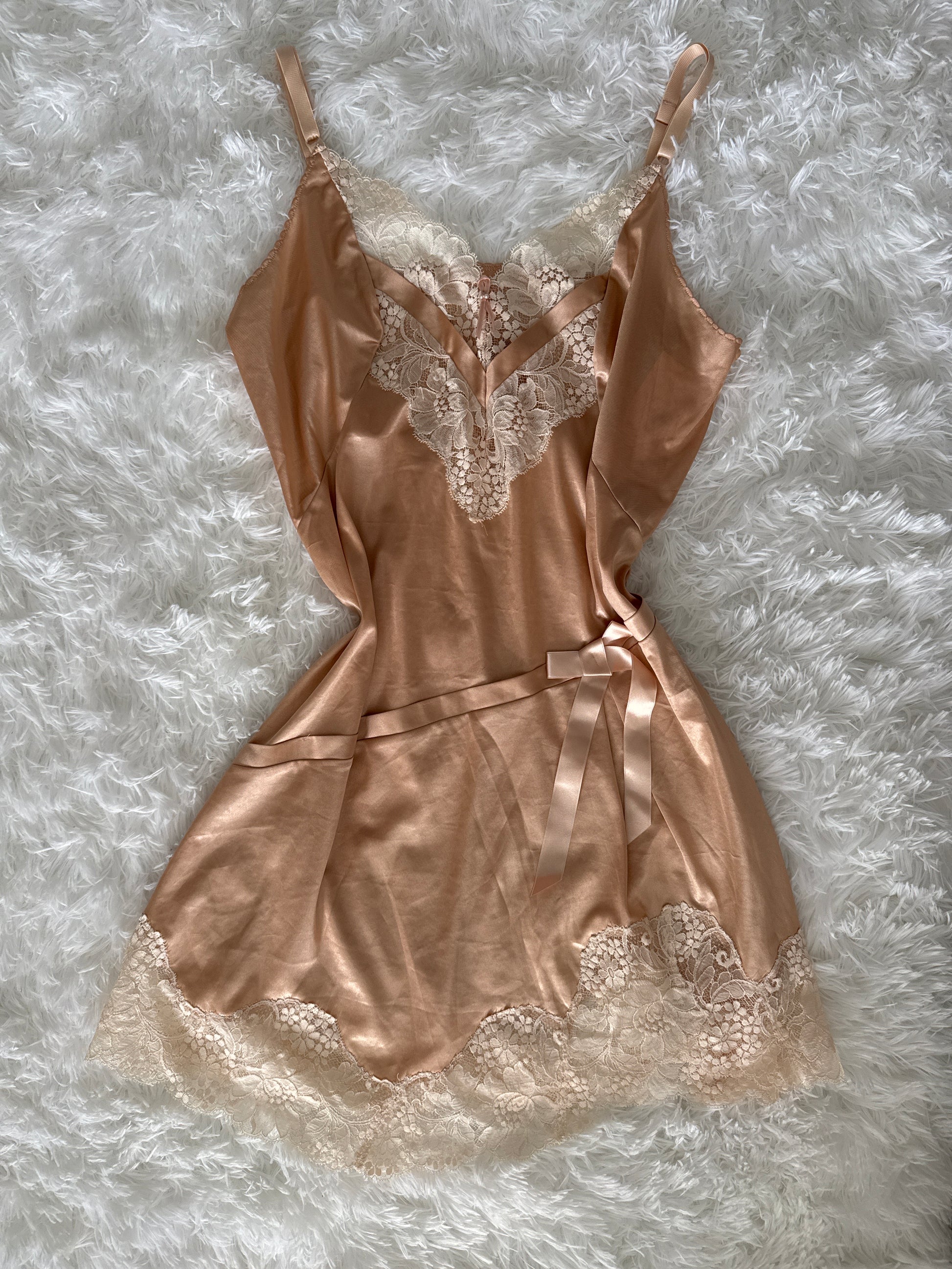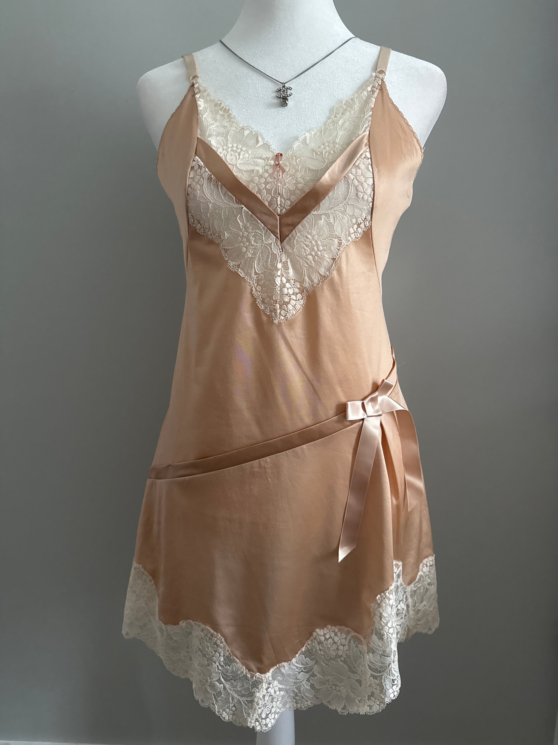 this blush pink silk slip dress is effortlessly elegant, featuring a flattering v-neckline adorned with delicate embroidery. the asymmetrical side bow adds a unique, playful touch, making it perfect for a sophisticated cocktail party.