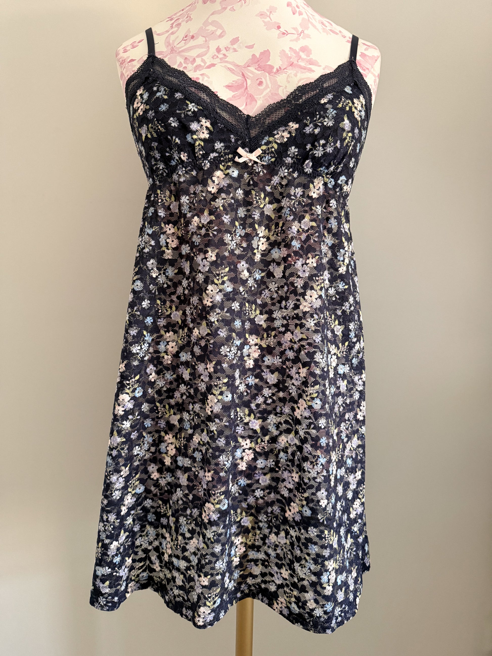 navy floral slip dress with sheer lace bust and pastel flower print throughout. features a small satin bow accent, adjustable straps, and soft flowy drape. gives moody garden-at-dusk energy. perfect for layering under a knit or wearing solo on a starry night stroll.