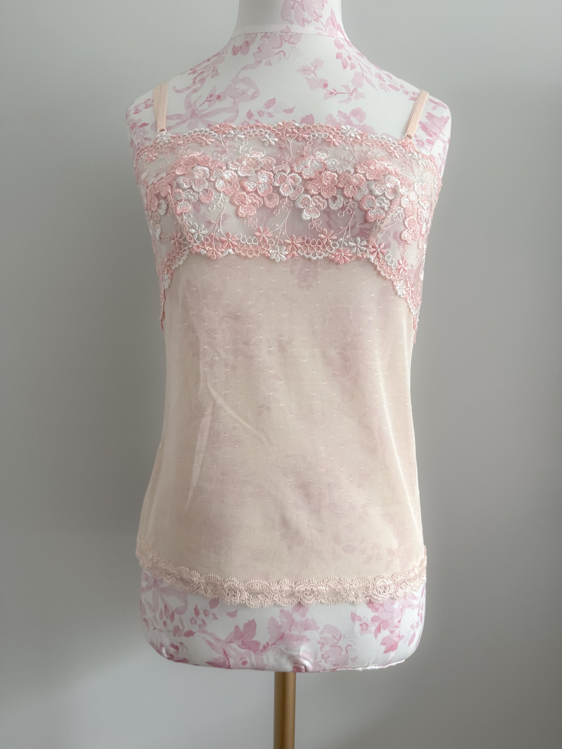 sheer blush cami dusted with glittery shimmer and delicate floral lace perfect for mimosa brunches, petal-soft kisses, and mornings that taste like pink champagne