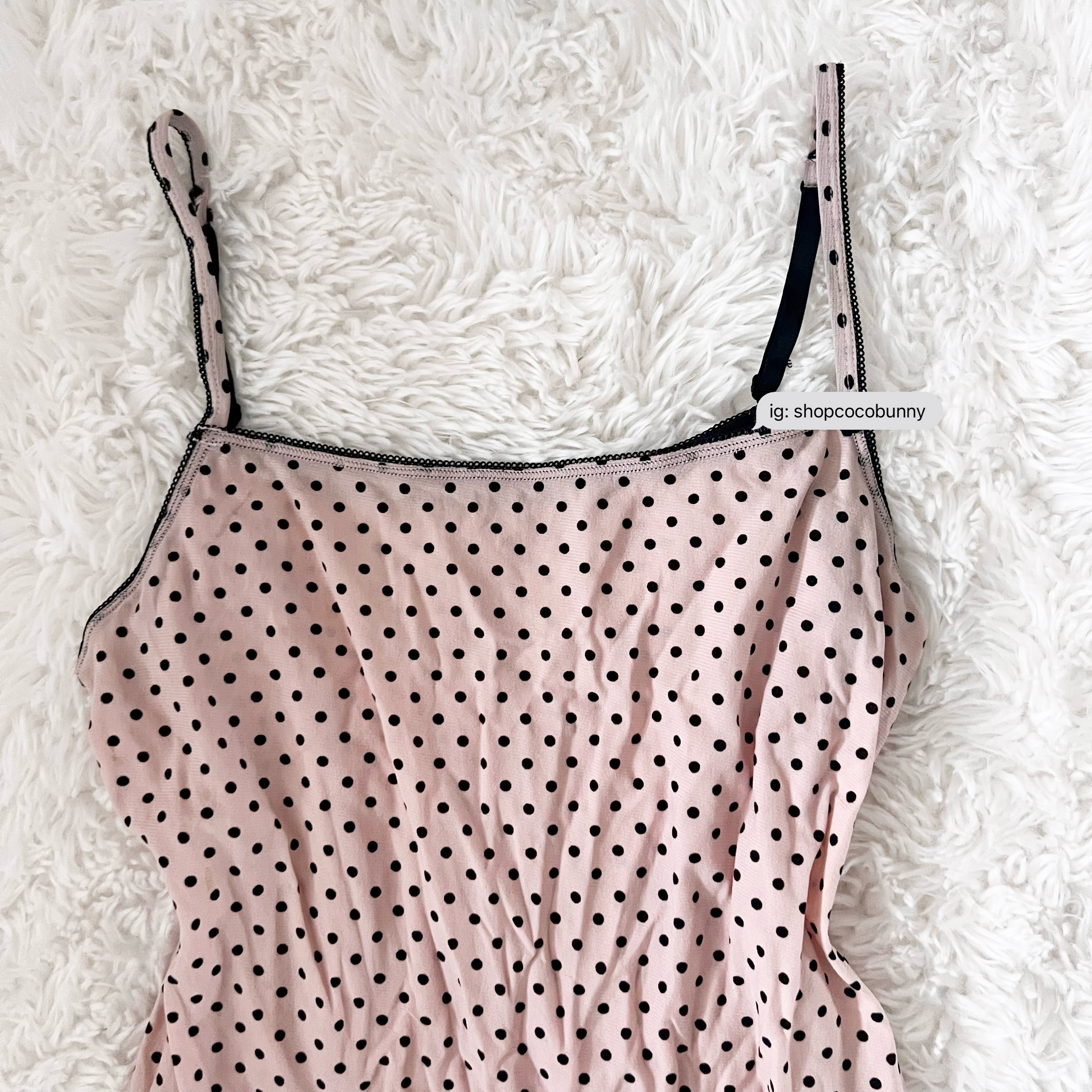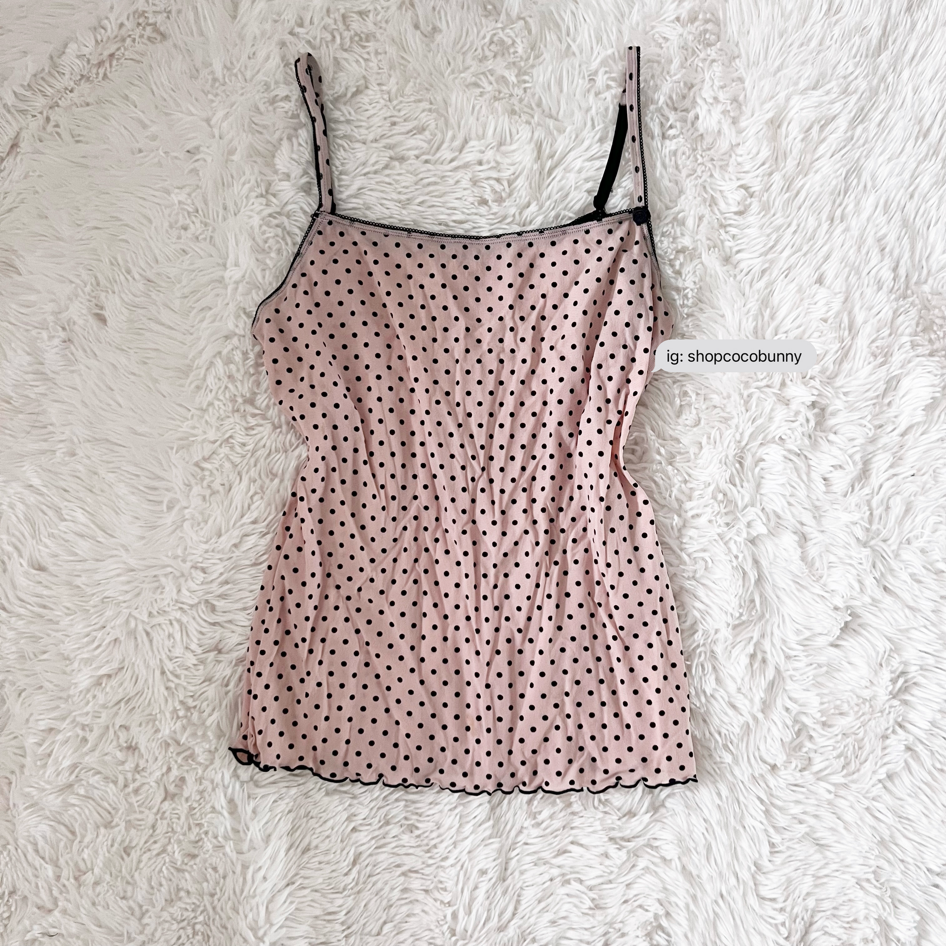 luxurious camisole decorated with a delicate mini polka dot print and enhanced with a slightly fitted silhouette. featuring thin spaghetti straps and a ruffle hem