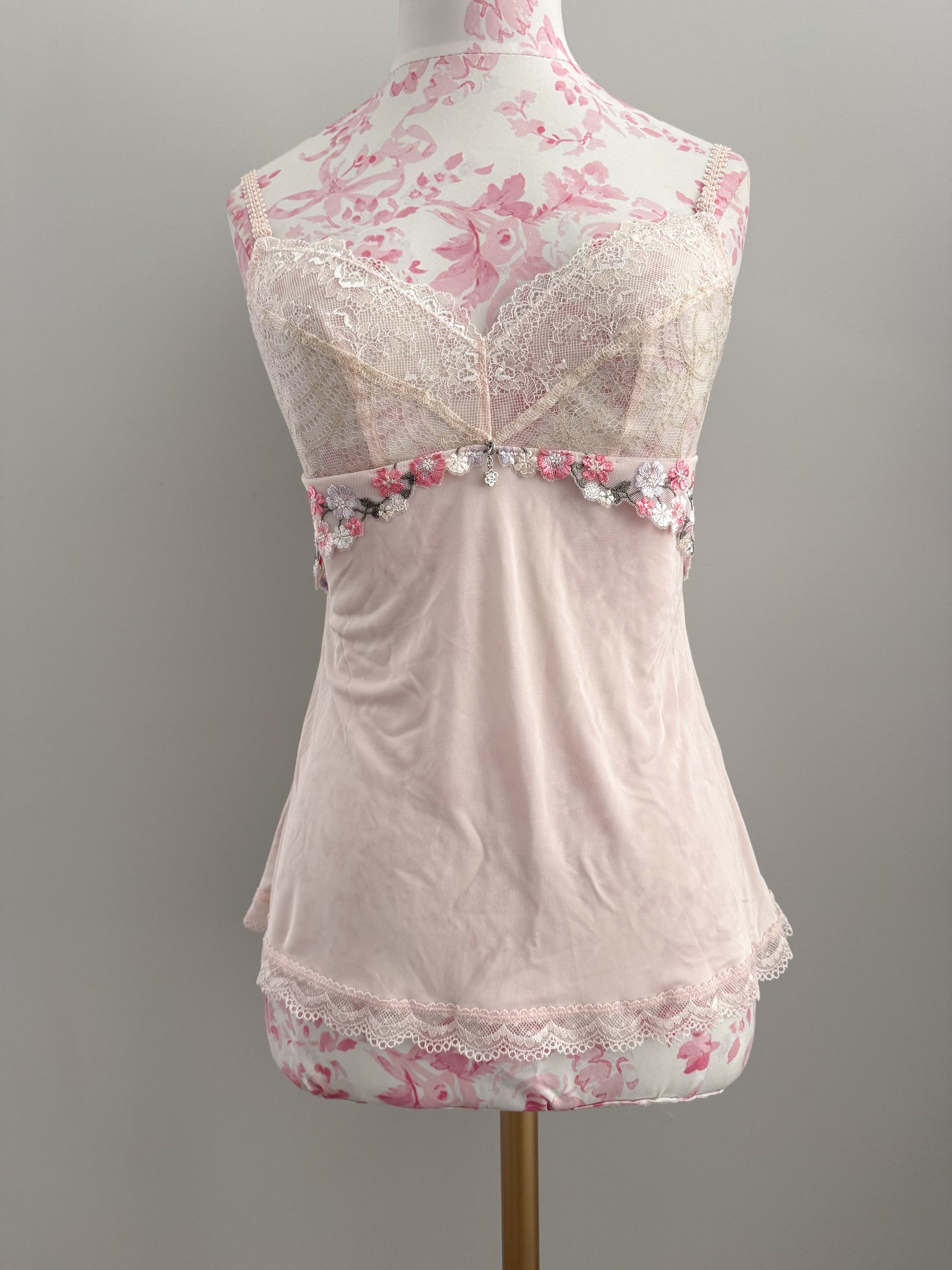 a soft blush-pink slip with delicate champagne lace along the bust and tiny pastel floral appliqués under the bust. the body has that silky, drapey feel that makes it look dreamy and lightweight on. one date idea: a slow morning date with strawberry cream croissants and a walk through a rose garden.