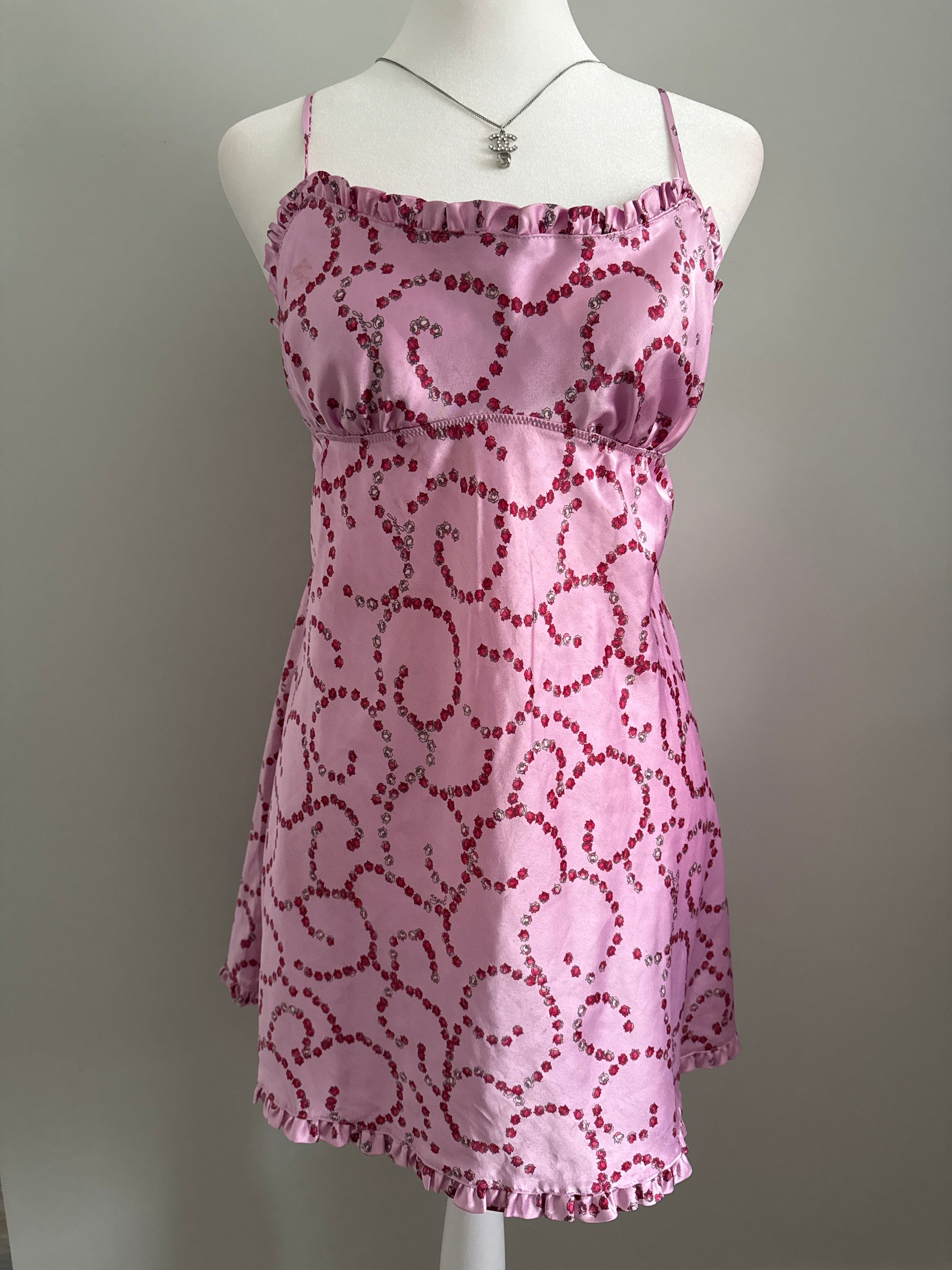 the infamous pinterest dress that exudes subtle details with bold heart prints and rose shapes. features delicate ruffle hem, sweetheart neckline, adjustable straps, and keyhole tie in the back making it the perfect going out dress