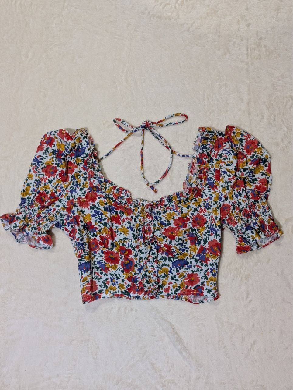 cropped blouse in a vibrant red, blue, and yellow floral print. puff sleeves with ruffle trim, a sweetheart neckline, and an adjustable tie at the back for a romantic, cottagecore feel. perfect for summer picnics or pairing with a flowy midi skirt for a playful date look.